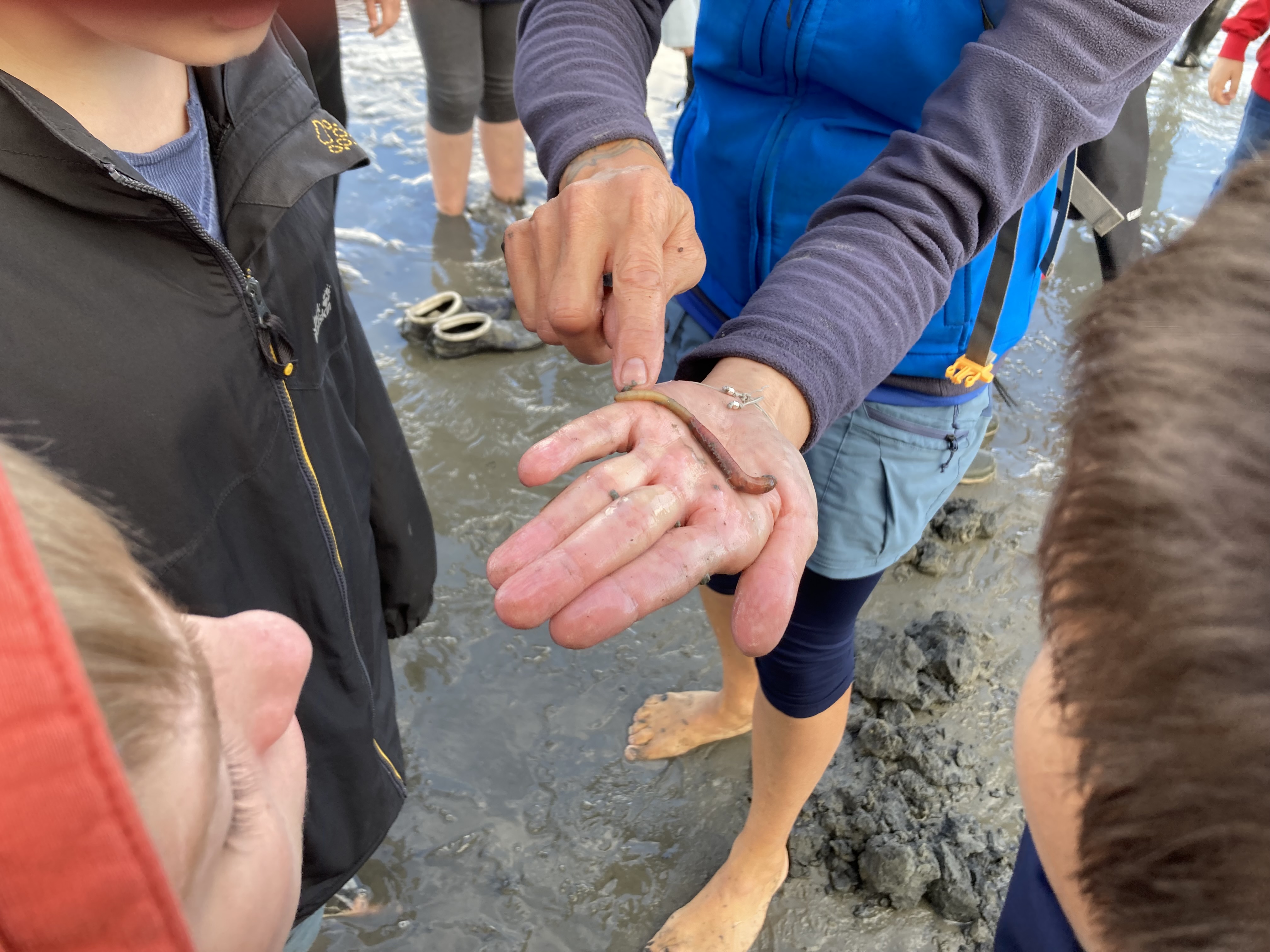 Nachdem wir unsere Regenjacken und Gummistiefel angezogen und einige Infos zum Wattenmeer bekommen hatten, ging die Wattführerin mit uns auf die Suche nach den „Small Five“, das sind die fünf wichtigsten kleinen tierischen Bewohner des Wattenmeeres (Wattwurm, Wattschnecke, Strandkrabbe, Nordseegarnele und Herzmuschel). Das erste, das wir gefunden haben, war ein toter Krebs, oder vielmehr: die leere Hülle eines gehäuteten Krebses. Zu dem Krebs hat uns die Wattführerin viel erzählt und gezeigt. Der ganze Weg war voll mit Krebsen und Wurmhaufen. Nur konnten wir keine Würmer sehen, bis dann die Wattführerin mit einer Schaufel den Wattboden aufgrub und einen Pierwurm herauszog. Er war rot, gelb und lang. Nachdem wir ihn näher angeschaut hatten, sagte die Wattführerin uns, dass es auf dem Wattboden ganz kleine Schnecken gibt. Daraufhin versuchten viele, eine auf die Hand zu nehmen und zu betrachten. Nebenbei sammelten wir viele Muscheln. Anschließend nahm die Wattführerin ein paar der gesammelten Muscheln und brachte sie dazu, zu „tanzen", indem sie sie auf das Watt legte und wartete, bis sie sich bewegten und ihren Fuß herausstreckten, um sich wieder zurück in den Schlick zu graben.