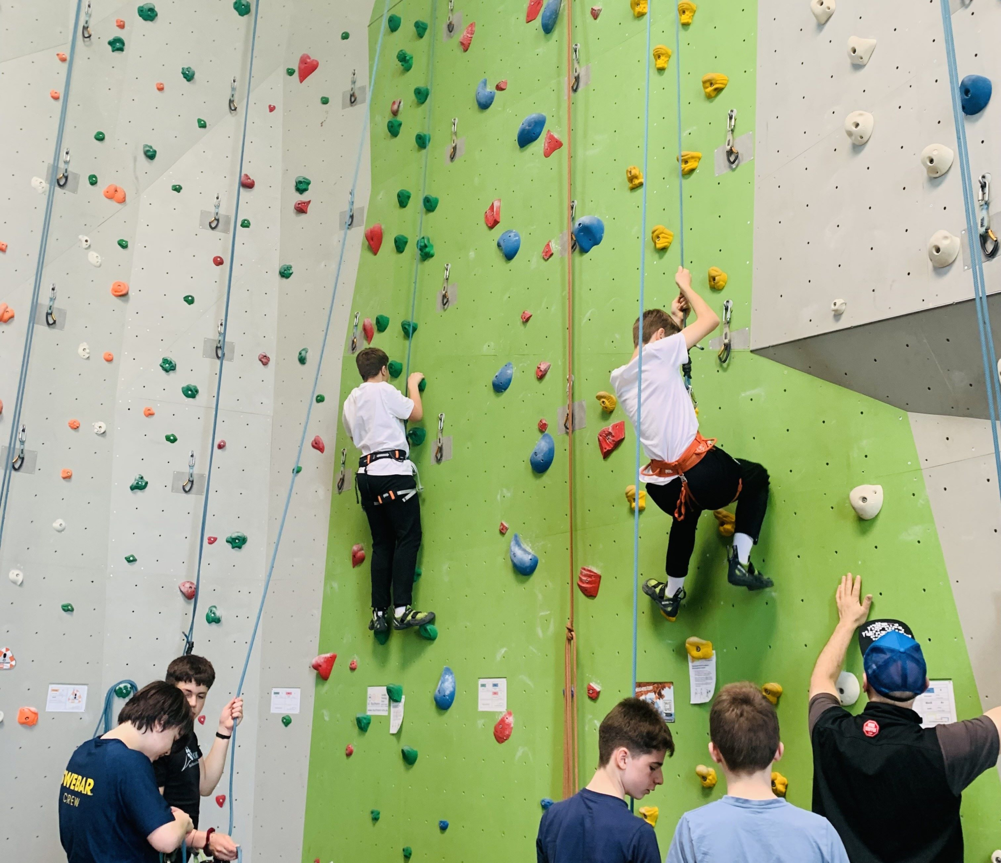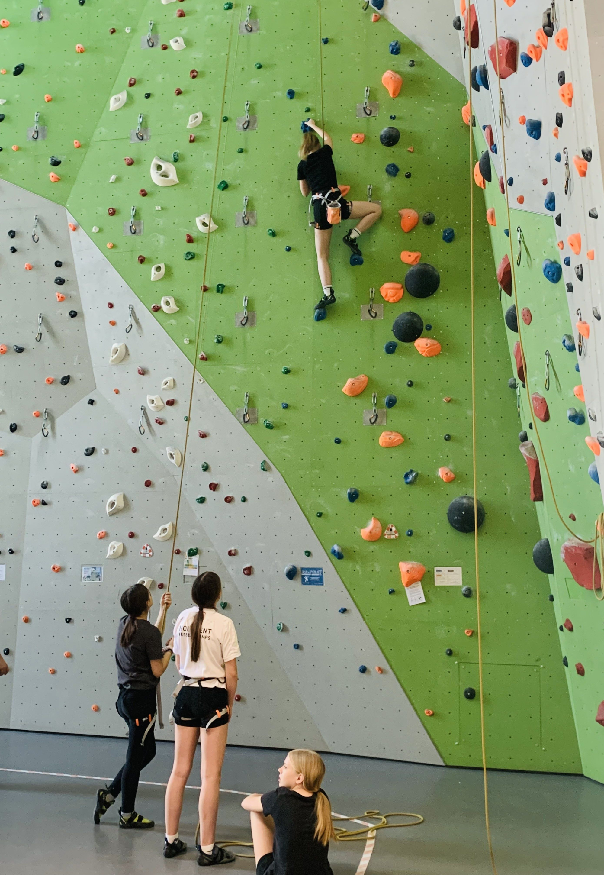 So erging es nun auch einigen KWGlerinnen und KWGlern aus der Klasse 8b während ihres Wandertages, als sie hoch zur Hallendecke schauten. Bis dahin sind es 14 Meter, die sie hochklettern sollten. Schnell erkannten die Schülerinnen und Schüler, dass es beim Klettern nicht nur um Geschicklichkeit und Ausdauer geht. Mindestens genauso wichtig sind Team-Fähigkeit und die Übernahme von Verantwortung. Denn man muss sich ab dem ersten Meter darauf verlassen können, dass der Kletterpartner oder die Kletterpartnerin aufmerksam sichert, bei Gefahren eingreift und vom Boden aus den ein oder anderen guten Tipp gibt, um eine sichere Route bis ganz nach oben zu finden.