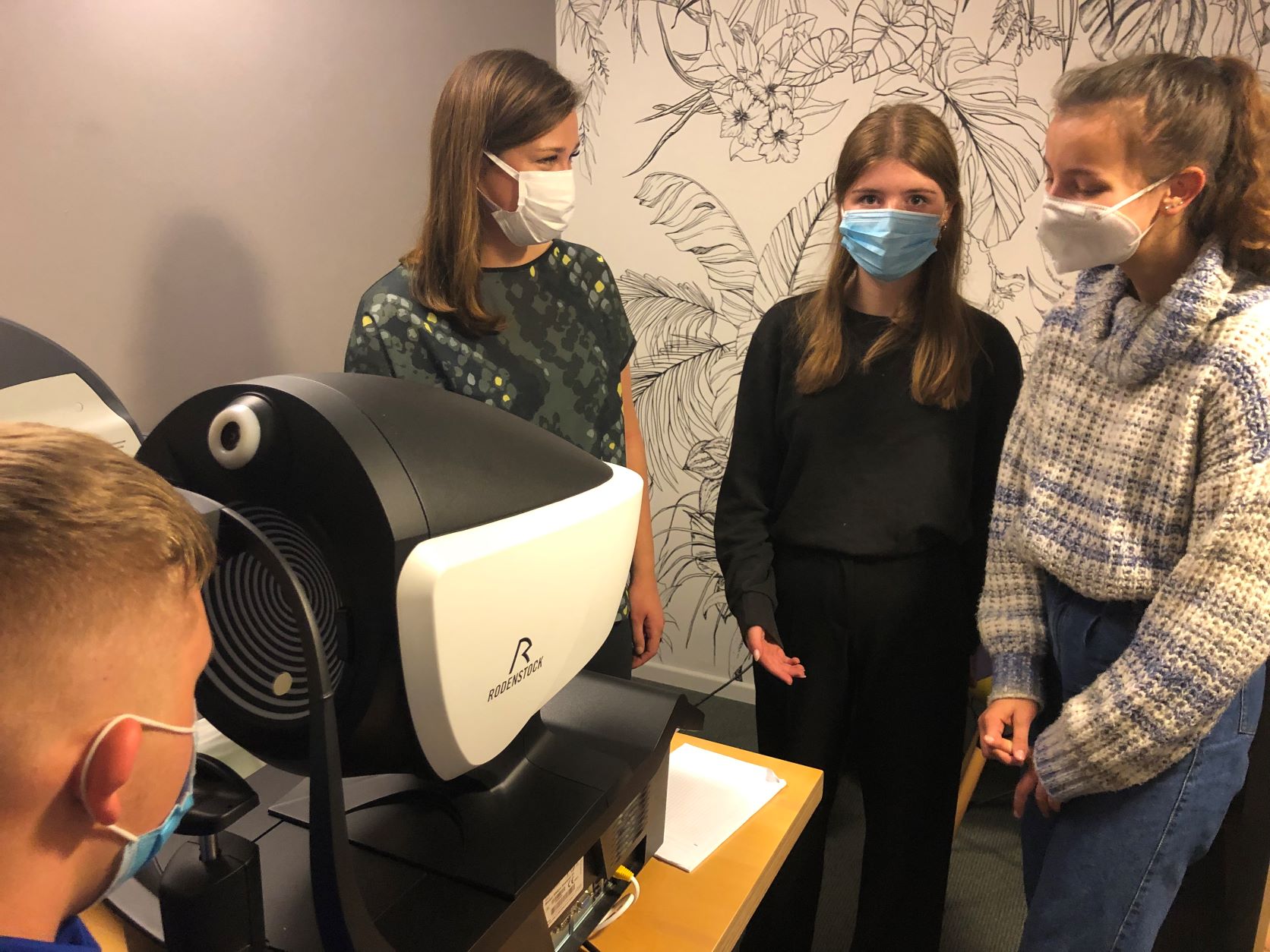 Wie bereits in den vergangenen Jahren werden von den Teams zudem Kontakte in die Arbeitswelt geknüpft. In diesem Jahr sind es z. B. unsere Schülerinnen Lina Kniffki und Annabel Weis, die von dem Unternehmen Krog Optik in Höxter die Möglichkeit bekamen, Messungen zur Kurzsichtigkeit bei ihren Mitschülerinnen und Mitschülern durchzuführen. Dafür Herrn Krog und seinen Mitarbeiterinnen schon einmal ein herzliches Dankeschön für die großartige Unterstützung!