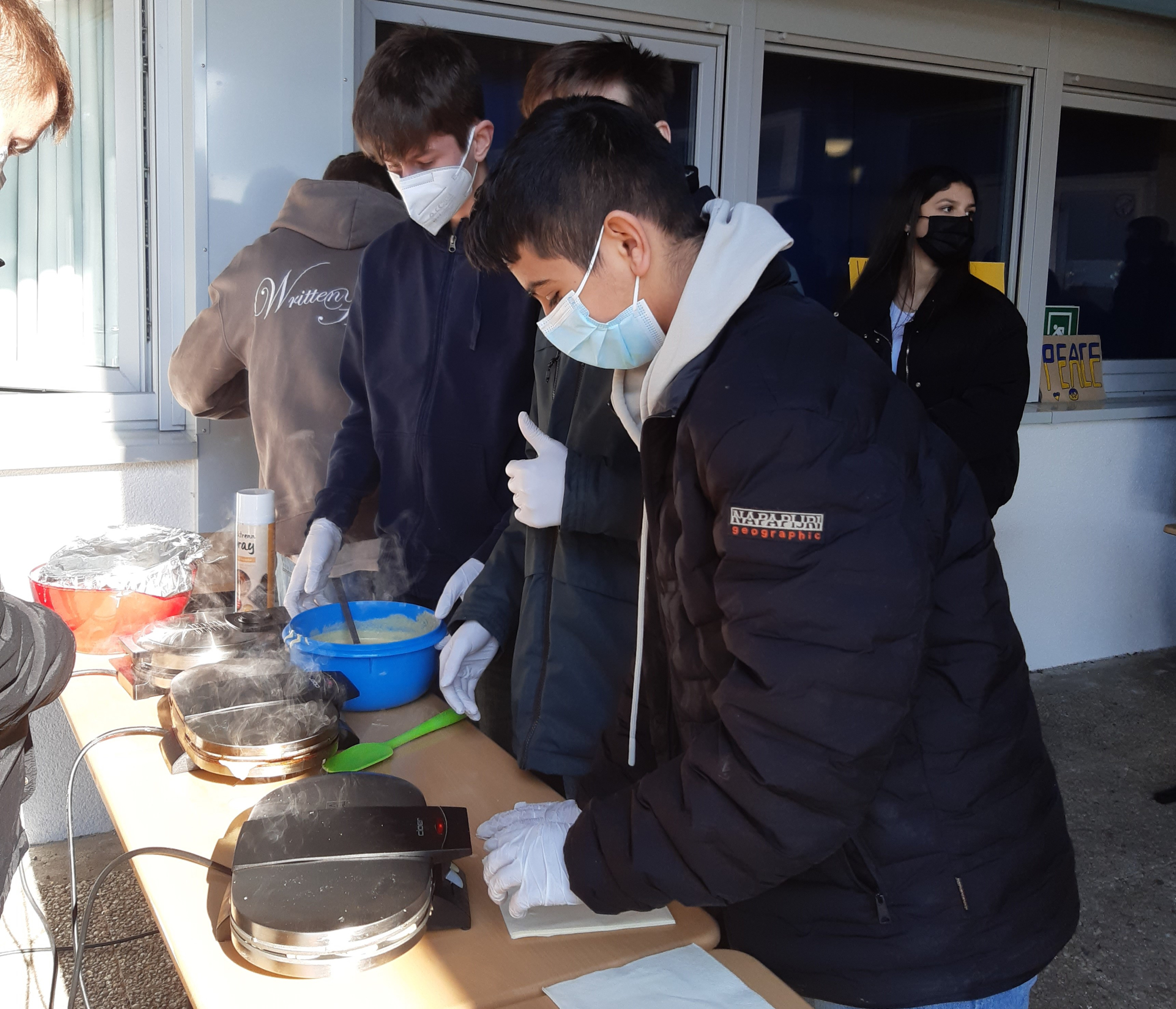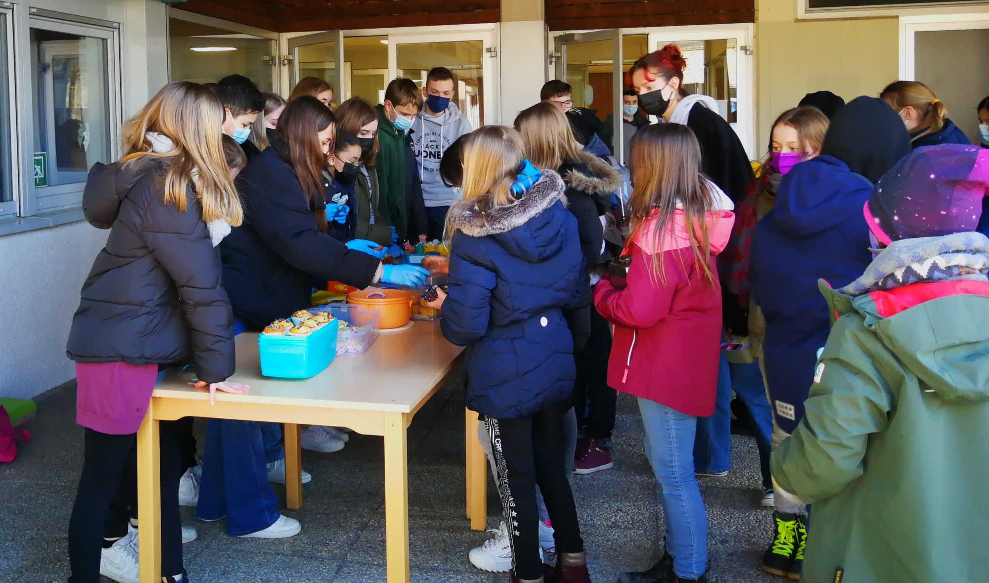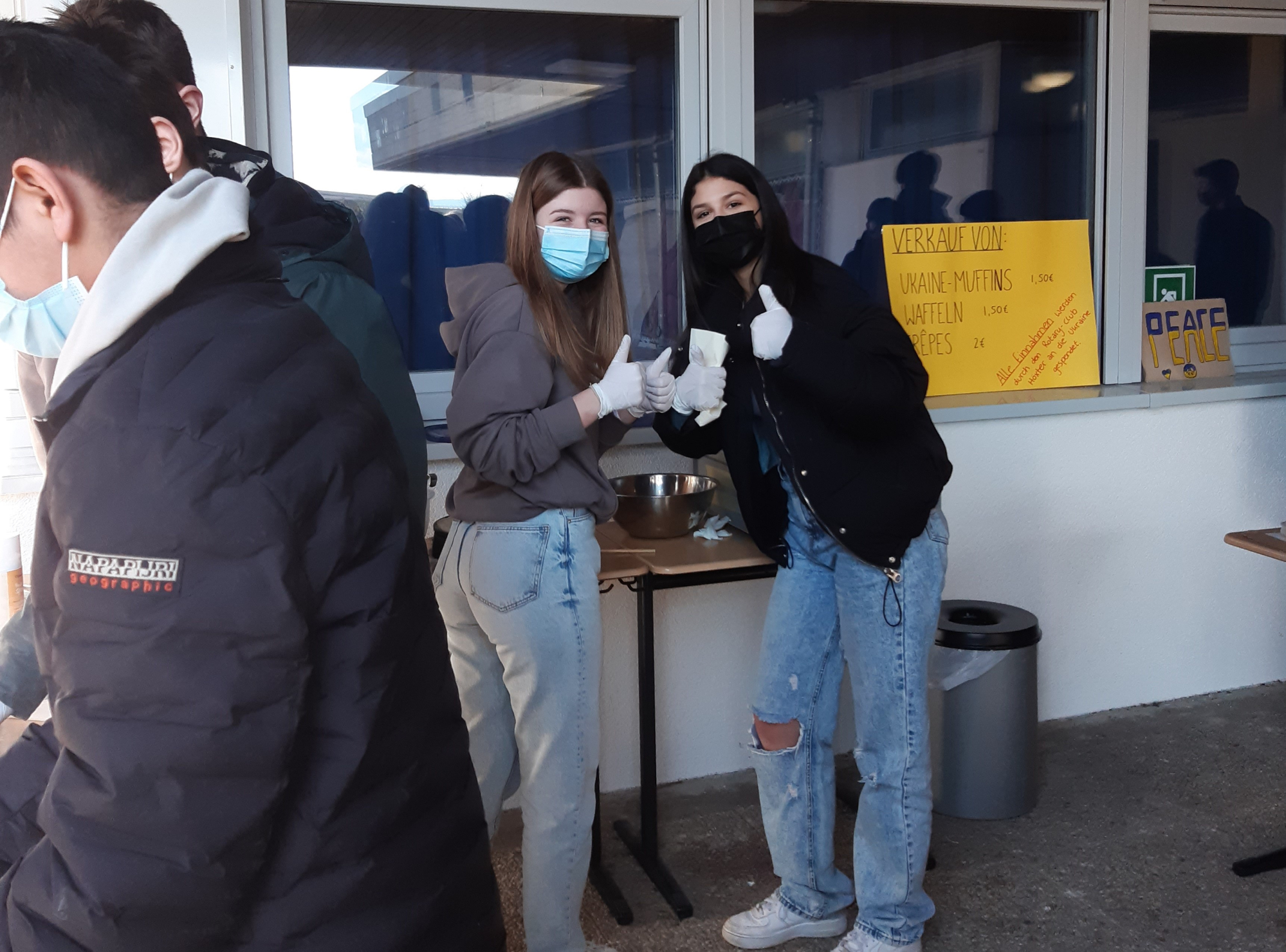 Die Klassen 7c und 9b backten an drei Tagen Waffeln, Crêpes und Muffins. Der süße Duft lockte in den Pausen zahlreiche KWGlerinnen und KWGler an den Verkaufsstand, so dass am Ende die stolze Spendensumme von 719,91 € für die Menschen in der Ukraine zusammenkam.