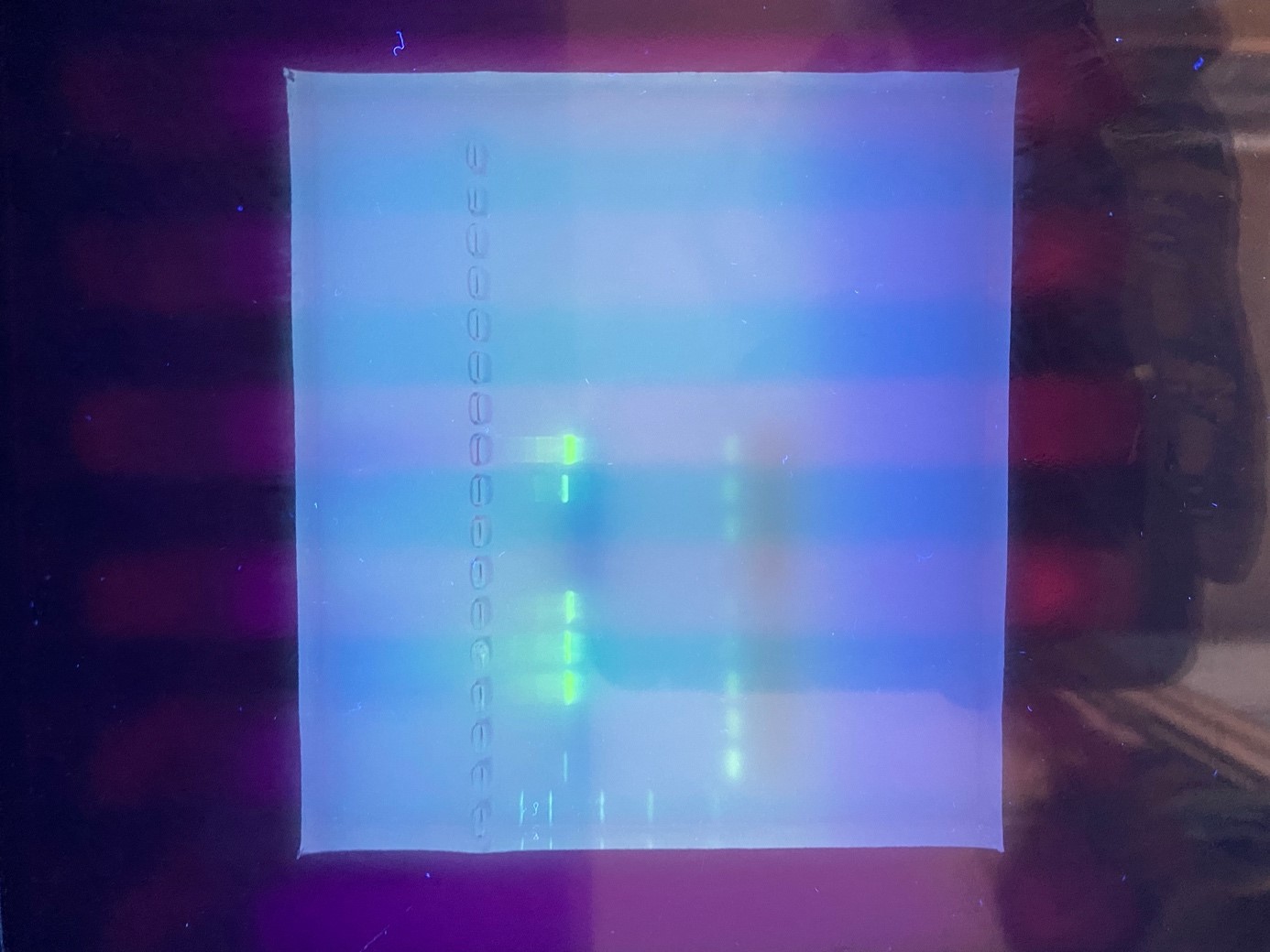 Nun folgte der letzten Schritte unseres Experiments, die Gelelektrophorese. In diesem Analyse-Prozess wird die rRNA in vorbereitete Taschen eines zuvor vorbereiteten Agarosegels eingefüllt, das die verschiedenen RNA-Fragmente nun mithilfe ihrer negativen Ladung anhand ihrer Länge separiert. Dies gab uns die Möglichkeit, unsere Ergebnisse zu überprüfen, weil das Gel die rRNA-Fragmente für das menschliche Auge sichtbar macht. Weil wir selbst keine Sequenzierung unserer rRNA vornehmen konnten, erhielten wir von der Laborleitung rRNA-Sequenzen, mit denen wir mithilfe eines Computerprogramms die Verwandtschaft der einzelnen Bakterienstämme anhand der rRNA-Basensequenz aufzeigen und in einem phylogenetischen Stammbaum darstellen konnten. Dadurch war noch einmal deutlich zu sehen, dass die einzelnen Bakterien trotz ihres unterschiedlichen Aussehens und ihrer unterschiedlichen Lebensräume trotzdem miteinander verwandt waren.