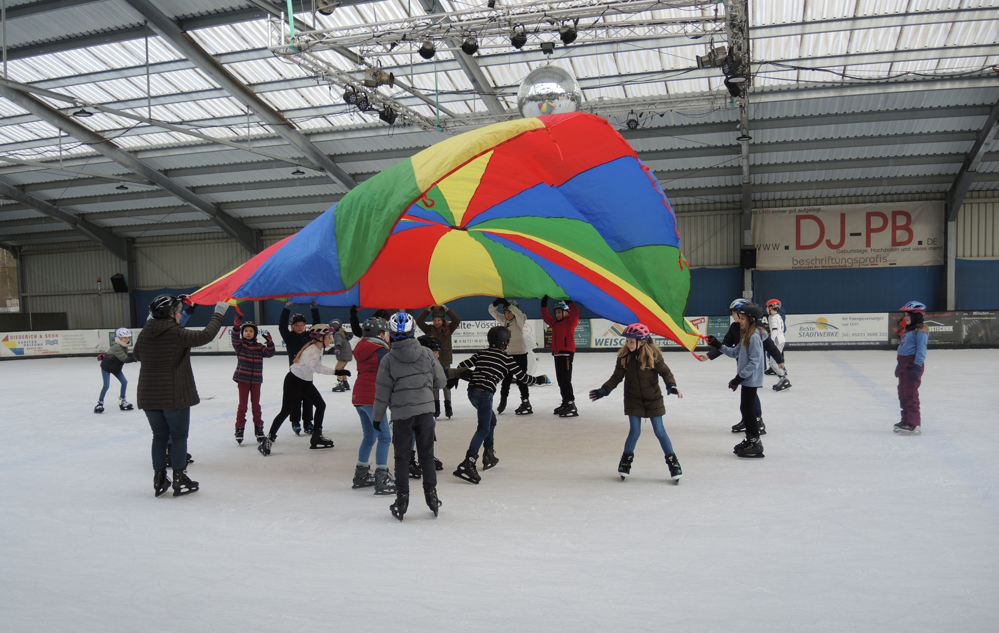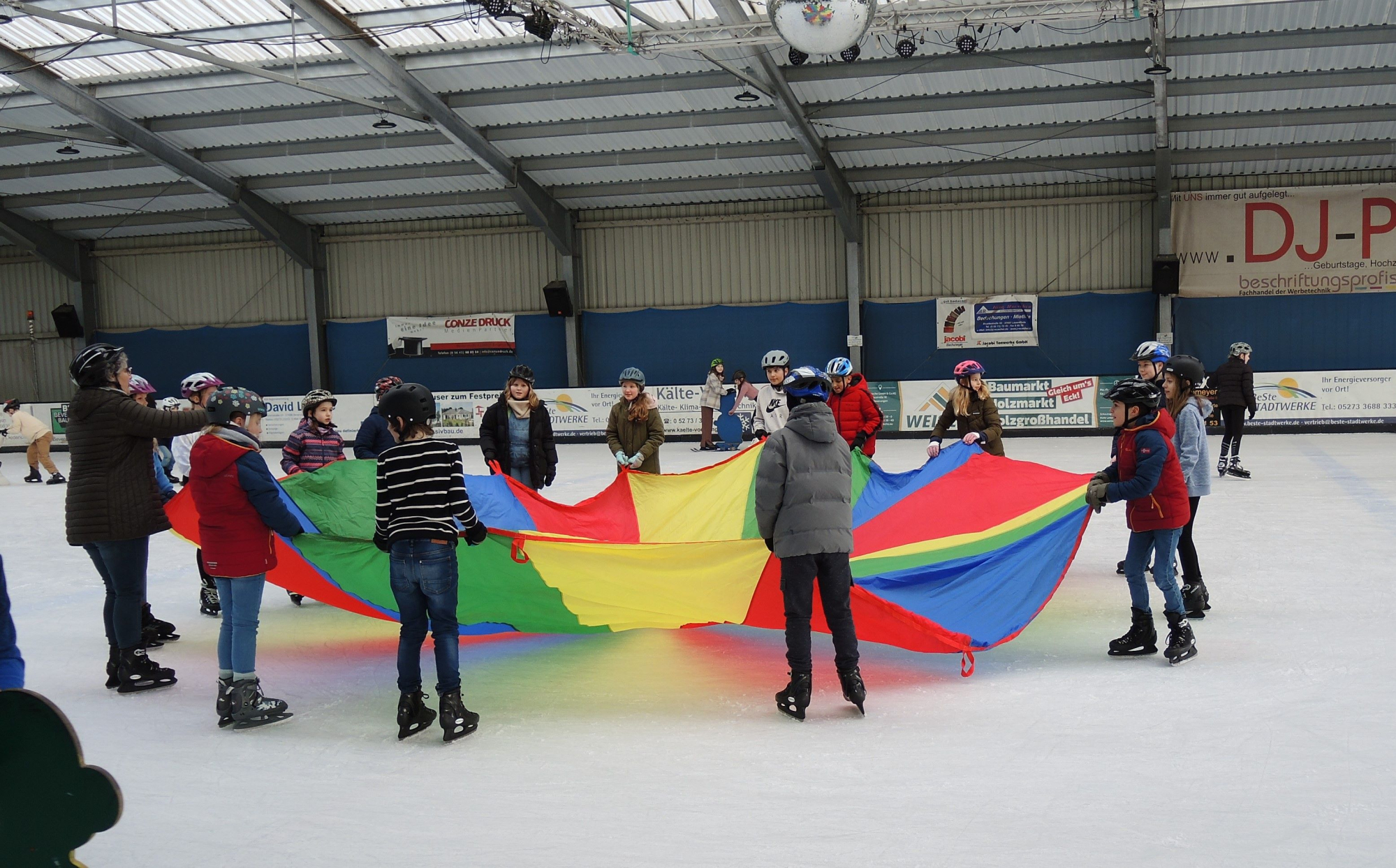 Aber nach den ersten schwierigen Runden auf dem Eis wurden wir sicherer und es machte riesigen Spaß! Wir spielten sogar Fangen und Frau Hartmann hatte ein Schwungtuch dabei, unter dem man hersausen konnte. Das war richtig schön! Sogar die Lehrerinnen und Lehrer düsten mehr oder weniger schnell, aber lächelnd über das Eis.